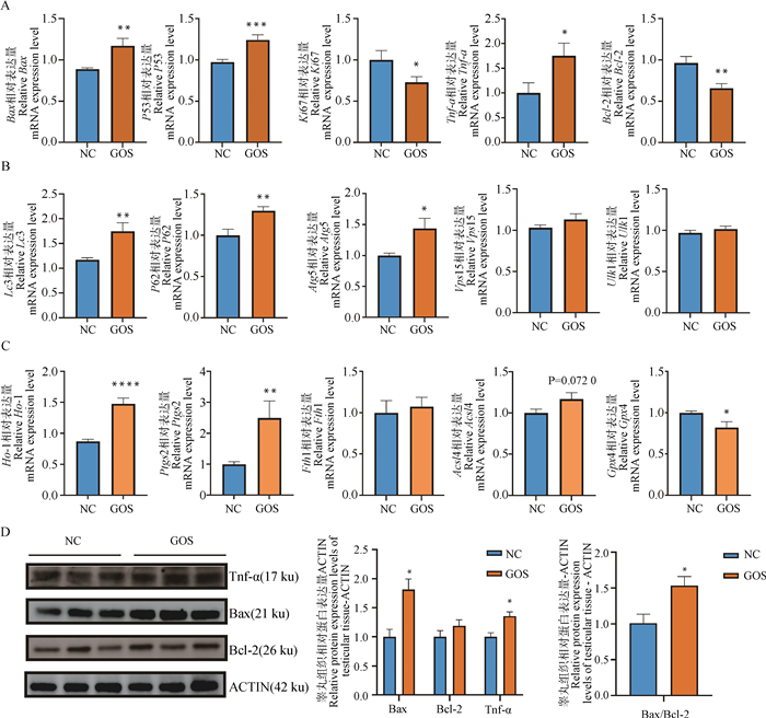 The changes in the expression levels of genes related to apoptosis, autophagy and ferroptosis in mice testicular tissues, as well as the expression levels of apoptosis-related proteins A. Relative expression levels of apoptosis-related genes Bax, P53, Ki67, Tnf-α and Bcl-2 in mice testicular tissue; B. Relative expression levels of autophagy-related genes Lc3, P62, Atg5, Vps15 and Ulk1 in mice testicular tissue; C. Relative expression levels of ferroptosis-related genes Ho-1, Ptgs2, Fth1, Acsl4, and Gpx4 in mice testicular tissue; D. The relative expression levels of apoptosis-related proteins Bax, Bcl-2, Tnf-α and Bax/Bcl-2 in mice testicular tissues"