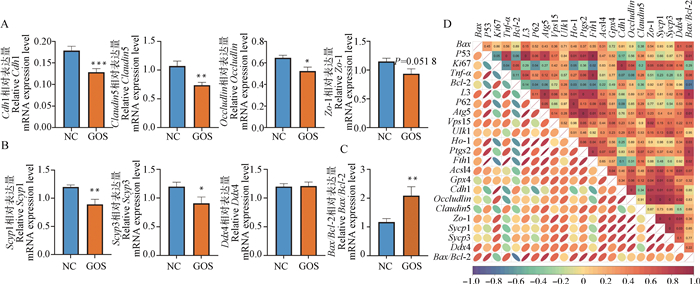 Changes in expression levels of tight junction and spermatogenesis-related genes in mice testicular tissue and their gene correlation analysis A. Relative expression levels of tight junction-related genes Cdh1, Claudin5, Occludlin, and Zo-1 in mice testicular tissue; B. Relative expression levels of spermatogenesis-related genes Sycp1, Sycp3, and Ddx4 in mice testicular tissue; C. The relative expression levels of apoptosis-related genes Bax/Bcl-2 in the testicular tissue of mice; D. The correlation heatmap of genes related to apoptosis, autophagy, ferroptosis, tight junction and spermatogenesis in the testicular tissue of mice"