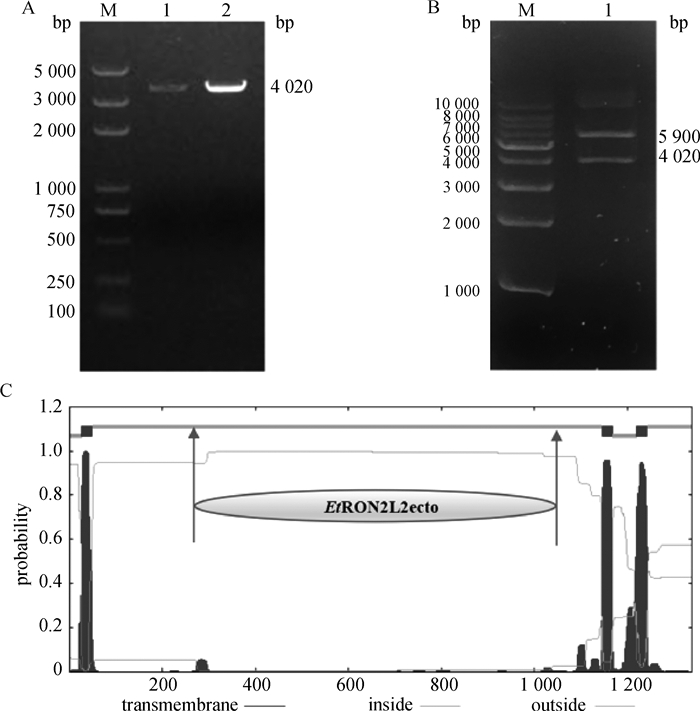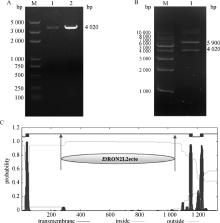 PCR amplification of EtRON2L2 gene, double enzyme digestion identification of recombinant plasmids and transmembrane structure analysis of EtRON2L2 protein A. PCR amplification of EtRON2L2 gene: M. DL-5000 DNA Marker; 1-2. PCR amplification products of EtRON2L2. B. Double enzyme digestion identification of recombinant plasmids: M. DL-10000 DNA Marker; 1. Recombinant cloning vector of pET-32a(+)-EtRON2L2. C. Transmembrane structure analysis of EtRON2L2 protein"