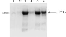 Western blot identification result of rEtRON2L2ecto 1. Whole cell protein containing pET-28a (+) empty plasmid; 2. Whole cell protein before induction; 3. Whole cell protein after induction; 4. Supernatant after ultrasonic lysis; 5. Precipitation after ultrasonic lysis; 6. Purified rEtRON2L2ecto"