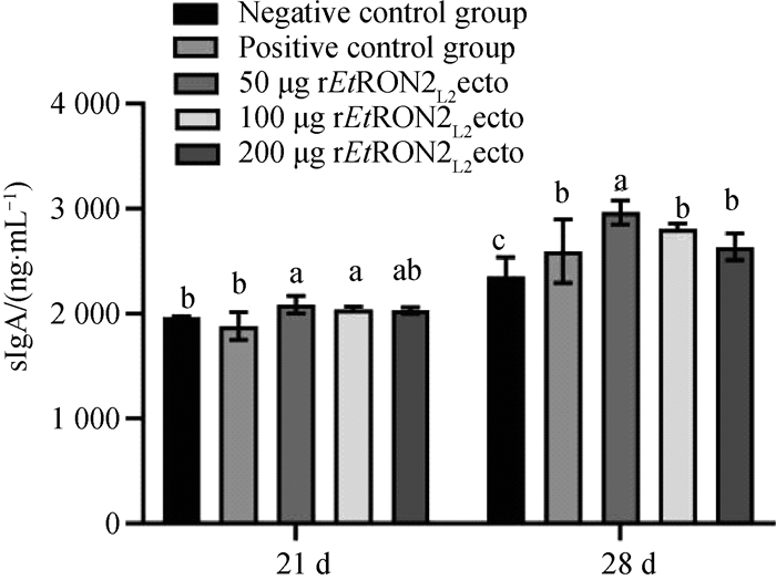 | 100 μg蛋白免疫组 100 μg rEtRON2L2ecto immune group | 47.02±0.86c | 0.40±0.19d |