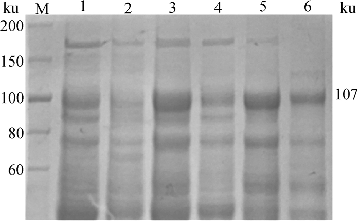 Solubility analysis and purification result of rEtRON2L2ecto protein M. Protein Marker(30-200 ku); 1. Whole cell protein containing pET-28a (+) empty plasmid; 2. Whole cell protein before induction; 3. Whole cell protein after induction; 4. Supernatant after ultrasonic lysis; 5. Precipitation after ultrasonic lysis; 6. Purified rEtRON2L2ecto"