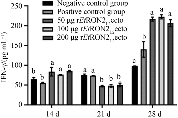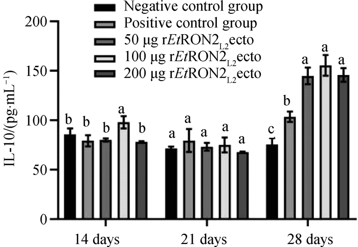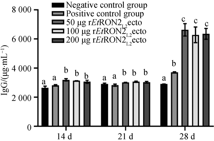 | 50 μg蛋白免疫组 50 μg rEtRON2L2ecto immune group | 41.87±0.75b | 4.01±0.27c |