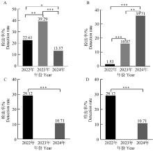 Statistical results of pathogen detection rates in different years in Ningxia region A. M. bovis Statistics of detection rate in different years; B. Mh Statistics of detection rate in different years; C. K.pn Statistics of detection rate in different years; D. Pm Statistics of detection rate in different years."