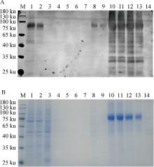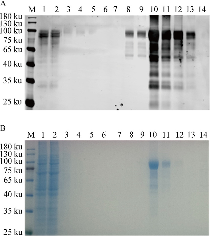 Identification the purification effect of B1-Fc via Western blot(A)and SDS-PAGE(B) M. DNA marker; 1. Supernatant; 2. Flow through fluid; 3-7. 10 mmol ·L-1 imidazole wash solution; 8-9. 50 mmol ·L-1 imidazole wash solution; 10-13. 250 mmol ·L-1 imidazole wash solution; 14. Blank supernatant"