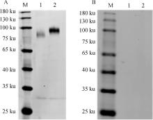 Identification the purification effect of B2-Fc via Western blot(A)and SDS-PAGE(B) M. DNA marker; 1. Supernatant; 2. Flow through fluid; 3-7. 10 mmol ·L-1 imidazole wash solution; 8-9. 50 mmol ·L-1 imidazole wash solution; 10-13. 250 mmol ·L-1 imidazole wash solution; 14. Blank supernatant"