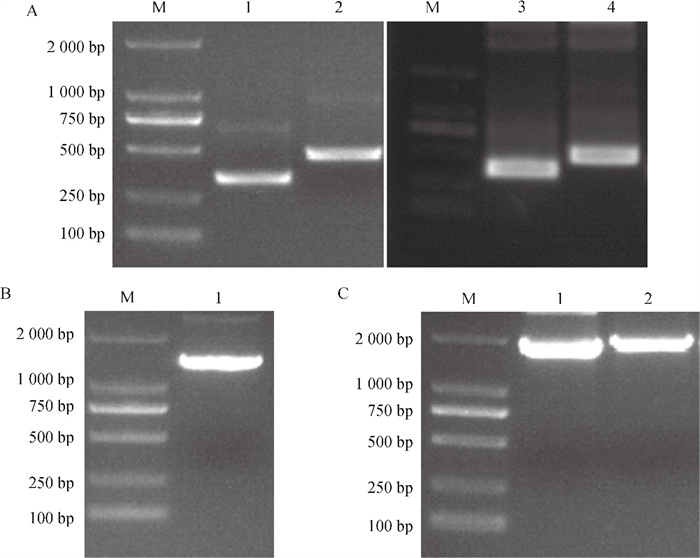 Amplification of target fragments A. Amplification of the B1-His, B2-His, B1-(G4S)3 and B2-(G4S)3 fragments (M. DNA marker; 1. B1-His fragment; 2. B2-His fragment; 3. B1-(G4S)3 fragment; 4. B2-(G4S)3 fragment); B. Amplification of the (G4S)3-IgY Fc-His fragment[M. DNA marker; 1. (G4S)3-IgY Fc-His fragment]; C. Amplification of the B1-Fc-His、B2-Fc-His fragments (M. DNA marker; 1. B1-Fc-His fragment; 2. B2-Fc-His fragment)"