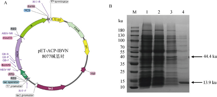 Vector construction model and SDS-PAGE purification diagram A. Vector construction model; B. SDS-PAGE purification diagram: M. Protein ladder; 1. Empty vector after induction; 2. Ultrasonic crushing supernatant; 3. Ammonium sulfate precipitate supernatant; 4. Molecular sieve purification supernatant"