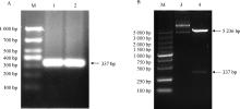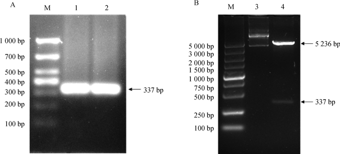 Construction and identification of recombinant plasmid pET-30a-LSDV ORF002 A. PCR-amplified ORF002 gene from LSDV(M. DNA marker; 1, 2. PCR product of the ORF002 gene); B. Identification of recombinant plasmid pET-30a-LSDV ORF002 by enzyme digestion(M. DNA marker; 3. pET-30a(+)-LSDV ORF002;4. The digestion of recombinant plasmid pET-30a(+)-LSDV ORF002 by NdeⅠ and XhoⅠ)"