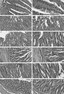 Histopathological results of chicken cecum (pictures on the left line: 200×, bars=50 μm; pictures on the right line: 400×, bars=20 μm) A. Control group; B. Et group; C. 1 mL·kg-1 BP group; D. 5 mL·kg-1 BP group; E. 10 mL·kg-1 BP group; F. CCP group. The dotted arrows point to the oocyst, the black arrows point to the gametophyte, and the black outline arrows point to the goblet cell, the dashed arrows point to the epithelial cells of intestinal mucosa"