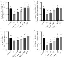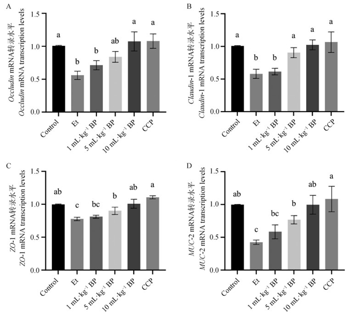 Cecal gut barrier associated protein mRNA transcript levels A. Occludin mRNA transcript levels; B. Claudin-1 mRNA transcript level; C. ZO-1 mRNA transcript levels; D. MUC-2 mRNA transcript level. The same lowercase letters on the column indicate no significant difference (P>0.05), while different lowercase letters indicate significant difference (P < 0.05). The same as below"