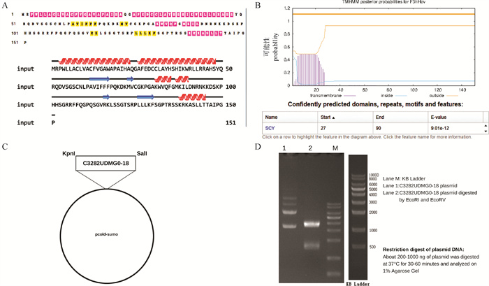 Construction and identification of the recombinant plasmid vector pCold-SUMO-CCL25 A. Secondary structure prediction of CCL25; B. Prediction of the transmembrane region of CCL25; C. Schematic diagram of the construction of pCold-SUMO-CCL25 recombinant plasmid; D. Verification of the recombinant plasmid by double digestion (M. KB Ladder; 1. pCold-SUMO-CCL25 plasmid; 2. pCold-SUMO-CCL25 plasmid digested by EcoRI and EcoRV)"