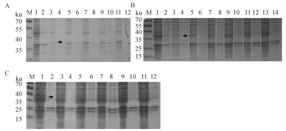 Optimization of the induction expression conditions of porcine-derived recombinant CCL25 A. Screening at different sampling times (M. Marker; 1.pCold-SUMO supernatant; 2.pCold-SUMO pellet; 3, 5, 7, 9, 11. pCold-SUMO-CCL25 supernatant 8, 12, 16, 20, 24 h sampling; 4, 6, 8, 10, 12. pCold-SUMO-CCL25 pellet at 8, 12, 16, 20, 24 h sampling); B. Screening at different OD600 nm (1. pCold-SUMO supernatant; 2 pCold-SUMO pellet; 3, 5, 7, 9, 11.pCold-SUMO-CCL25 supernat at OD600 nm=0.2, 0.4, 0.6, 0.8, 1.0; 4, 6, 8, 10, 12. pCold-SUMO-CCL25 pellet at OD600 nm=0.2, 0.4, 0.6, 0.8, 1.0, 1.2); C. Screening at different IPTG (M. Marker; 1, 3, 5, 7, 9, 11.pCold-SUMO-CCL25 supernatant at IPTG=0, 0.2, 0.4, 0.6, 0.8, 1.0 mmol ·L-1; 2, 4, 6, 8, 10, 12.pCold-SUMO-CCL25 pellet at IPTG=0, 0.2, 0.4, 0.6, 0.8, 1.0 mmol ·L-1)"