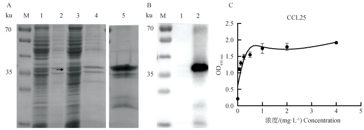 Purification and identification of porcine CCL25 A.Identification of purified pCold-SUMO-CCL25 by SDS-PAGE (M. Marker; 1. pCold-SUM supernatant; 2. pCold-SUMO pellet; 3. pCold-SUMO-CCL25 supernatant; 4. pCold-SUMO-CCL25 pellet; 5. Purified pCold-SUMO-CCL25 protein); B. Identification of purified pCold-SUMO-CCL25 by Western blot (1. pCold-SUMO; 2. Purified porcine CCL25 protein); C. Purified porcine CCL25 by ELISA"