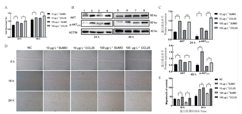 Functional identification of porcine-derived recombinant CCL25 A.CCK8 assay; B.Western blot (1.5.10 μg ·L-1 SUMO; 2.6.10 μg ·L-1 CCL25; 3.7.100 μg ·L-1 SUMO; 4.8.100 μg ·L-1 CCL25); C.Bar analysis of the gray value of B by ImageJ. D.Scratch assay (Scale bar: 500 μm); E.Bar analysis of the scratch distance of D by ImageJ (ns. No significant difference, *.P < 0.05 **.P < 0.01, ***.P < 0.001)"