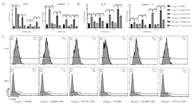 The effects of CCL25 on cell inflammation, apoptosis and death by RT-qPCR and FCM A.RT-qPCR detection of IL-8 and caspase-3 expression at the transcriptional level in PBMC cells; B.RT-qPCR detection of IL-8 and caspase-3 expression at the transcriptional level in IPEC-J2 cells; C.PBMC flow cytometry 7-AAD expression"
