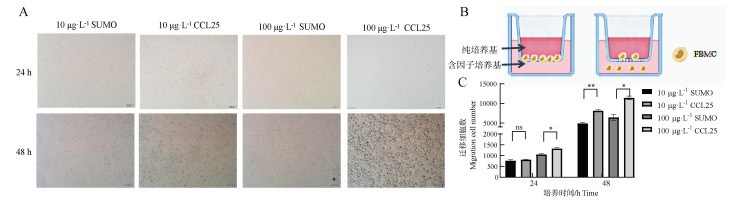 Detection of CCL25 chemotaxis of PBMC cells using Transwell A. Counting of cells in the lower chamber of the Transwell (scale bar: 500 μm); B. Schematic diagram the operation of the Transwell experiment; C. Histogram analysis of the cell number in A by ImageJ (ns. No significant difference, *. P < 005, **. P<0.01, ***. P < 0.001)"