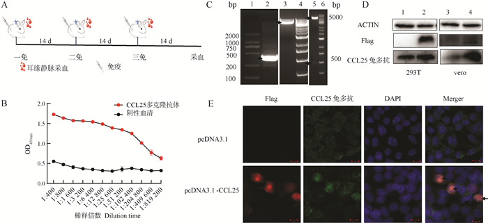 Preparation and identification of rabbit polyclonal antibody A.Schematic diagram of the immunization process for the rabbit polyclonal antibody; B.ELISA detection of antibody titer; C.Construction and double enzyme digestion identification of pcDNA3.1-CCL25 (1.2 000 DNA marker; 2.PCR amplification product CCL25 gene; 3.Double enzyme digestion of pcDNA3.1 plasmid; 4.6.1 kd marker; 5.pcDNA3.1-CCL25 plasmid digested by EcoRI and XhoⅠ); D.Western blot (1.3.10 μg pcDNA3.1; 2.4.1.0 μg pcDNA3.1-CCL25); E.Conf detection of the co-localization of CCL25 rabbit polyclonal antibody and tag (Scale bar: 10 μm)"
