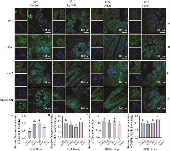Immunofluorescence staining and fluorescence intensity of NSE, S100A1, CGA and NEUROD1 in bronchioles and bronchioles of yak lungs A. The fluorescence intensity of NSE in yak bronchioles and bronchioles of different ages; B. The fluorescence intensity S100A1 in yak bronchioles and bronchioles of different ages; C. The fluorescence intensity CGA in yak bronchioles and bronchioles of different ages; D. The fluorescence intensity NEUROD1 in yak bronchioles and bronchioles of different ages, different lowercase letters mean significant difference (P < 0.05)"