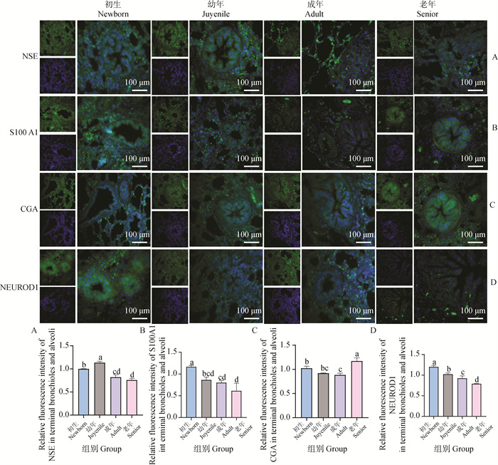 Immunofluorescence staining and fluorescence intensity of NSE, S100, CGA and NEUROD1 in yak lung terminal bronchioles and alveoli A. The fluorescence intensity of NSE in terminal bronchioles and alveoli of yak at different ages; B. The fluorescence intensity of S100A1 in terminal bronchioles and alveoli of yak at different ages; C. The fluorescence intensity of CGA in terminal bronchioles and alveoli of yak at different ages; D. The fluorescence intensity of NEUROD1 in terminal bronchioles and alveoli of yak at different ages, different lowercase letters mean significant difference (P < 0.05)"