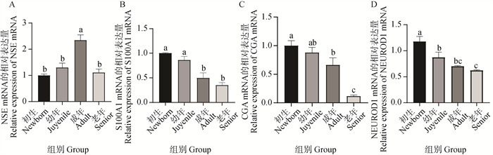 Transcription levels of NSE、S100A1、CGA and NEUROD1 genes in the lungs of yaks of different ages A. Expression of NSE mRNA level in the lungs of yaks of different ages; B. Expression of S100A1 mRNA level in the lungs of yaks of different ages; C. Expression of CGA mRNA level in the lungs of yaks of different ages; D. Expression of NEUROD1 mRNA level in the lungs of yaks of different ages. Different lowercase letters mean significant difference (P < 0.05)"