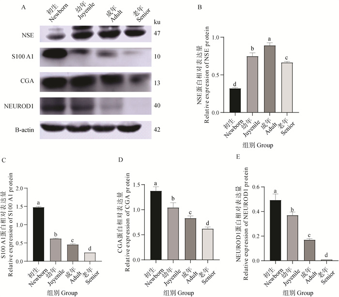 Expression analysis of NSE, S100A1, CGA and NEUROD1 proteins in the lungs of yaks of different ages A. The Western blot results of NSE, S100 A1, CGA and NEUROD1 proteins; B. Expression of NSE protein in the lungs of yaks of different ages; C. Expression of S100 A1 protein in the lungs of yaks of different ages; D. Expression of CGA protein in the lungs of yaks of different ages; E. Expression of NEUROD1 protein in the lungs of yaks of different ages. Different lowercase letters mean significant difference (P < 0.05)"