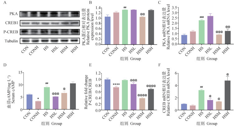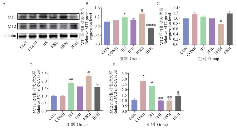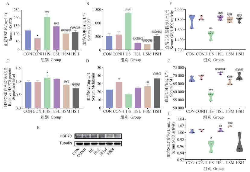 Effects of melatonin on heat stress-related indicators (n=3) A. Serum levels of HSP70; B. Serum levels of CORT; C. Relative protein level of HSP70; D. Serum levels of melatonin; E. Protein levels of HSP70 in adrenal gland; F. GSH-Px activity in serum; G. Serum levels of GSH; H. SOD activity in serum. Symbol (*) represents the significant difference between the CONH group and the CON group, *.P < 0.05, **.P < 0.01, ***.P < 0.001, ****.P < 0.000 1; Symbol (#) represents the significant difference between HS group and CON group, #.P < 0.05, ##.P < 0.01, ###.P < 0.001, ####.P < 0.000 1; Symbol (@) represents the significant difference between Mel intervention group and HS group, @.P < 0.05, @@.P < 0.01, @@@.P < 0.001, @@@@.P < 0.000 1, the same as below"