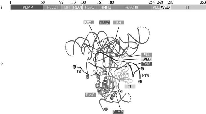 Structure of IsrB protein and IsrB-ωRNA-DNA ternary complex diagram[23] a. Schematic of IsrB protein domains. The IsrB protein primarily consists of the N-terminal PLMP domain, RuvC domain, WED domain, and TI domain. The PLMP domain, located at the N-terminus of the protein, is involved in protein localization; The WED domain is mainly involved in binding to both the protein and DNA; The RuvC domain is related to DNA cleavage; The TI domain is related to the stability of the protein. b. IsrB-ωRNA-DNA ternary complex diagram. The ωRNA binds to the complementary sequence of DNA, directing the protein to recognize specific DNA sequences; The WED domain forms hydrogen bonds with the single-stranded DNA terminus through specific amino acid residues; The RuvC domain forms direct chemical bonds with the DNA backbone through its catalytic active site, participating in DNA cleavage; PLL represents phosphate-lock loop. TI represents TAM-interacting region. TS represents target strand. NTS represents non-target strand"