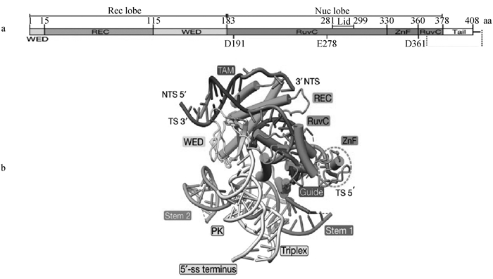 Structure of TnpB protein and TnpB-reRNA-DNA ternary complex diagram[32] a. Schematic of TnpB protein domains. The TnpB protein consists of an N-terminal recognition (Rec) lobe and a C-terminal nuclease (Nuc) lobe. The Rec lobe includes the REC and wedge (WED) domains. The Nuc lobe includes the RuvC domain and the ZnF domain. The REC domain is mainly responsible for recognizing DNA; The WED domain is primarily involved in binding to the protein and DNA; The RuvC domain is associated with DNA cleavage; The ZnF domain is related to DNA binding. b. Ternary structure of TnpB-reRNA-DNA. The reRNA binds to the complementary sequence of DNA, directing the protein to recognize specific DNA sequences; The WED domain forms hydrogen bonds with the single-stranded DNA terminus through specific amino acid residues; The RuvC domain forms direct chemical bonds with the DNA backbone through its catalytic active site, participating in DNA cleavage; The ZnF domain binds to specific DNA sequences through its zinc finger structure, making the binding more stable; TS represents target strand; NTS represents non-target strand"