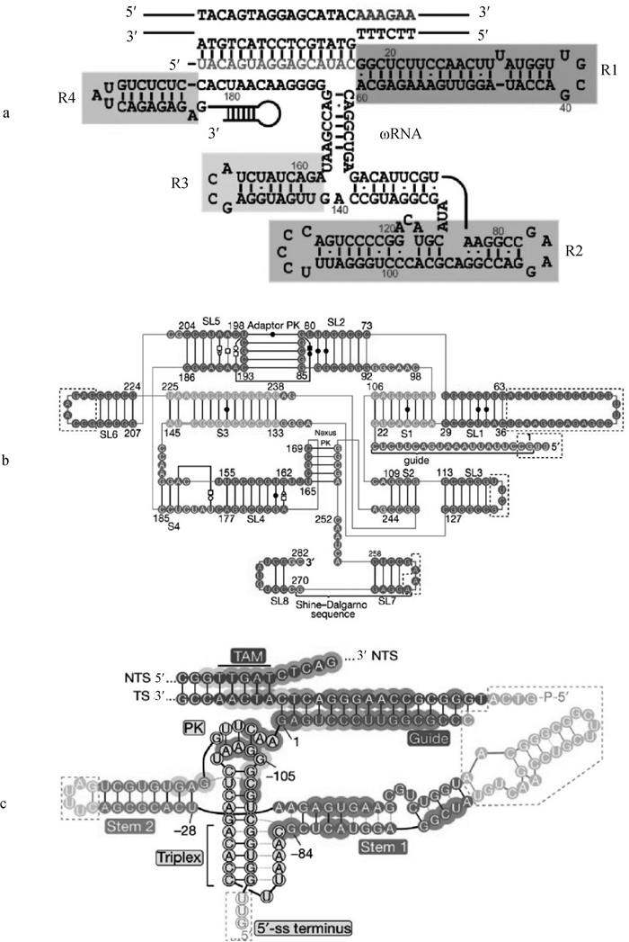 Predicted secondary structures of the guide RNAs from the IscB, IsrB and TnpB systems [23, 32, 36] a. The ωRNA of the IscB system is divided into 4 regions (R1, R2, R3, and R4);b. The ωRNA of the IsrB system is divided into 4 stems (S1-4) and 8 stem-loops (SL1-8); the adaptor PK is the junction pseudoknot structure formed by SL2 and SL5; the nexus PK is the nexus pseudoknot structure formed by the region between SL4, S2, and SL7; the Shine-Dalgarno sequence is a ribosome binding site in bacteria, located approximately 8 bases upstream of the mRNA start codon (usually AUG); c. The reRNA of the TnpB system is divided into stem 1 and 2; Triplex is triple helix structure; Stem is stem-loop structure; 5′-ss terminus is 5′ end terminal sequence; PK is pseudoknot structure; TS is target strand; NTS is non-target strand; TAM is target-adjacent motif"