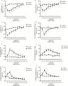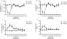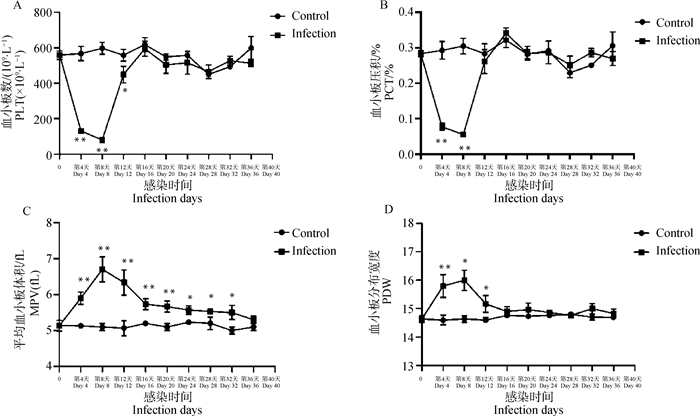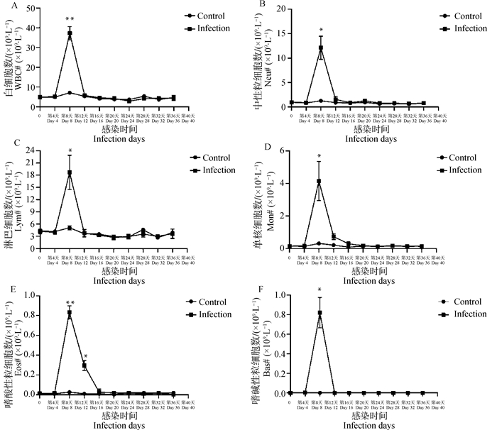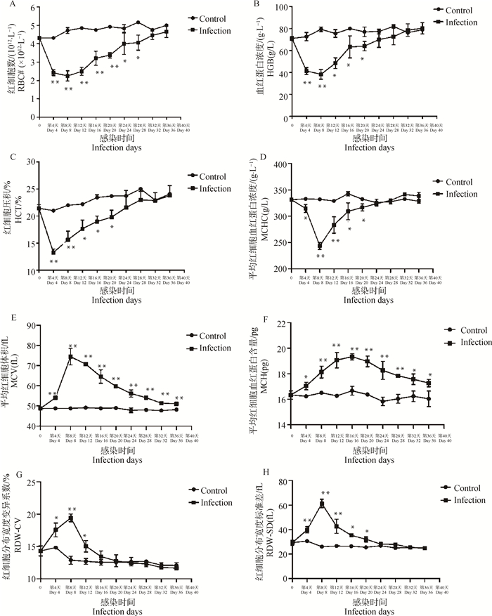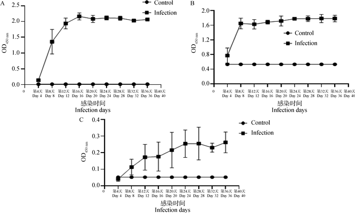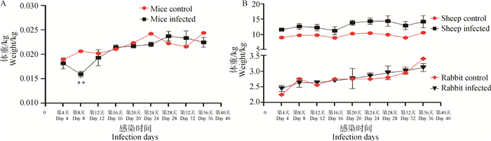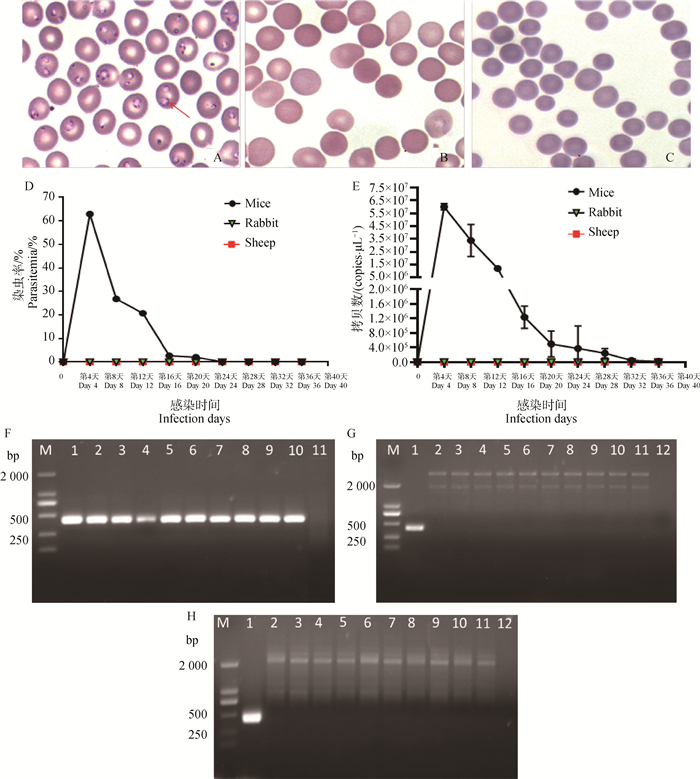 Babesia is a kind of zoonotic pathogen transmitted by ticks, surviving in human or animal red blood cells (RBCs). After infection, it can cause clinical symptoms such as fever, anemia and hemoglobinuria in humans or animals, and even death, posing a severe threat to the health of humans, especially those with asplenia, malignant tumors, and immunosuppression. Previous epidemiological surveys demonstrated the significant differences in the infection rates of Babesia in different domestic animals, but the specific pathogenic mechanisms remain unclear. This study aims to provide a basis for further elucidating the pathogenic mechanisms of Babesia, through comparing the infectivity, changes in blood indices, and immune responses of Babesia microti in different common laboratory animals. In this study, mice, rabbits and sheep were inoculated with B. microti respectively. Then parasitemia, blood parameters and anti-parasite specific protein antibodies were monitored from 0 to 36 d post-infection. The results showed that the parasitemia in mice reached the peak (62.9%) on the 4th day after innoculation, with a copy number of 6.05×107 copies·μL-1, while the parasitemia in New Zealand rabbits and sheep was about zero. Hematology tests demonstrated that the number of RBCs, hemoglobin concentration (HGB), and hematocrit (HCT) in the mice blood were significantly decreased during the early and middle monitoring term (0-20 d post-inoculation). During 0-8 d post-infection, the number of platelets (PLT) and platelet packed volume (PCT) were prominently lower than those in the control group, but with a backup later to a normal level. ELISA test showed that anti-B. microti secreted antigen 1 (BmSA1) antibody in mice increased continuously to the highest level at 16 d post-infection and then kept at high level until the end of the tested term. Anti-BmSA1 antibody in New Zealand white rabbits speedly rose up to the highest level at 8 d post-infection and persisted to the end of the mornitoring time, while sheep showed low immune response. The results suggest that mice were susceptible to B. microti which led to abnormal changes in the blood, while rabbits and sheep were resistant to the B. microti infection. This specificity may be associated with the genetic diversity of the recognition site in hosts. Rabbits and sheep demonstrated different anti-BmSA1 antibody levels, which hinted the innate differences in the anti-Babesia mechanisms of the two species. The present study laid a base for further research on the Babesia-host interaction mechanism, as well as vaccine and drug exploration.