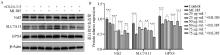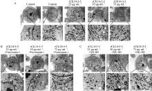 The ultrastructural changes of MAC-T in each treatment group were observed by transmission electron microscope(Bars of figures in the upper line=2 μm; Bars of figures in the lower line=500 nm) A. The internal ultrastructure morphological changes of cells in positive control group and experimental group Ⅰ; B. The ultrastructural morphological changes of the cells in the experimental group Ⅱ; C. Ultrastructural morphological changes of cells in experimental group Ⅲ"