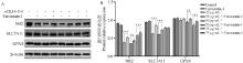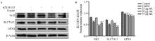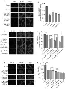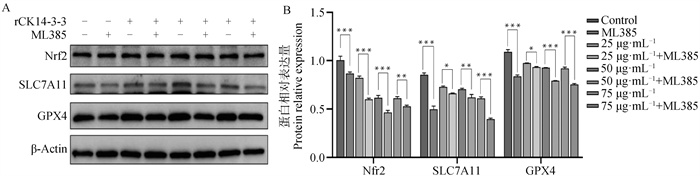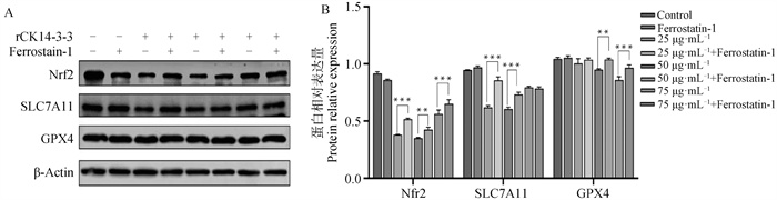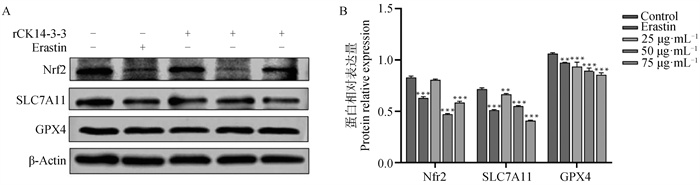 The effect of Erastin and rCK14-3-3 protein on the expression of Nrf2, SLC7A11 and GPX4 protein in MAC-T A. Western blot results of Nrf2, SLC7A11 and GPX4 proteins in MAC-T of positive control group and experimental group Ⅰ; B. Data analysis of Nrf2, SLC7A11 and GPX4 protein expression in MAC-T of positive control group and experimental group Ⅰ"