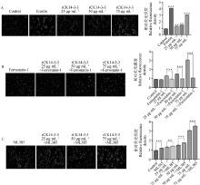 ROS fluorescence intensity in each treatment groups(200×) A. Fluorescence microscope was used to observe the fluorescence intensity of ROS in the positive signal group and the experimental group Ⅰ; B. ROS data analysis of positive signal group and experimental group Ⅰ; C. The fluorescence intensity of ROS in experimental group Ⅱ was observed by fluorescence microscope; D. ROS data analysis of experimental group Ⅱ; E. Fluorescence microscopy was used to observe the fluorescence intensity of ROS in the experimental group Ⅲ; F. ROS data analysis of experimental group Ⅲ"