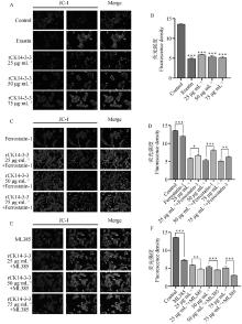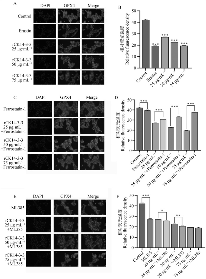 Immunofluorescence expression of GPX4 in each treatment group(200×) A. Fluorescence microscope was used to observe the fluorescence intensity of GPX4 in MAC-T cells of positive control group and experimental group Ⅰ; B. fluorescence intensity data analysis of positive control group and experimental group Ⅰ; C. Fluorescence microscope was used to observe the fluorescence intensity of MAC-T GPX4 in experimental group Ⅱ; D. experimental group Ⅱ fluorescence intensity data analysis; E. Fluorescence microscope was used to observe the fluorescence intensity of MAC-T GPX4 in experimental group Ⅲ; F. Experimental group Ⅲ fluorescence intensity data analysis"