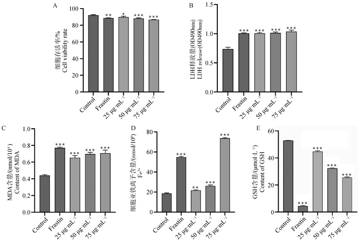 Effects of Erastin and rCK14-3-3 protein on the survival rate of MAC-T and the content of LDH, MDA, Fe2+and GSH A. Detection of cell survival rate in each treatment group; B. Comparison of LDH release in each treatment group; C. Comparison of MDA content in each treatment group; D. Comparison of Fe2+ content in each treatment group; E. Comparison of GSH content in each treatment group. *P < 0.05, **P < 0.01, ***P < 0.001, n=3, the same as below"