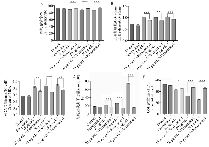 The effects of Ferrostatin-1 on the survival rate of MAC-T and the contents of LDH, MDA, Fe2+ and GSH A. Detection of cell survival rate in each treatment group; B. Comparison of LDH release in each treatment group; C. Comparison of MDA content in each treatment group; D. Comparison of Fe2+ content in each treatment group; E. Comparison of GSH content in each treatment group"