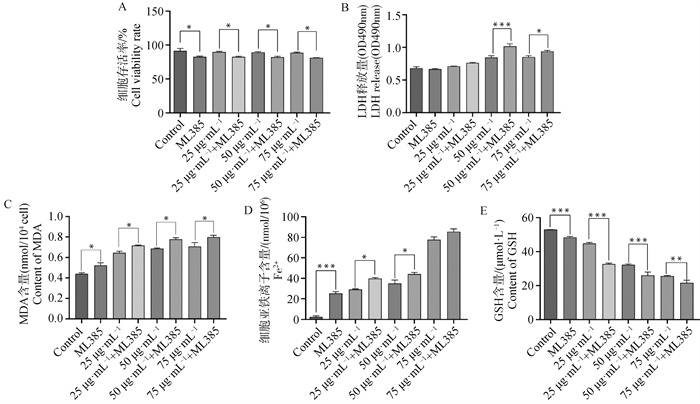 The effects of ML385 on the survival rate of MAC-T and the contents of LDH, MDA, Fe2+ and GSH A. Detection of cell survival rate in each treatment group; B. Comparison of LDH release in each treatment group; C. Comparison of MDA content in each treatment group; D. Comparison of Fe2+ content in each treatment group; E. Comparison of GSH content in each treatment group"