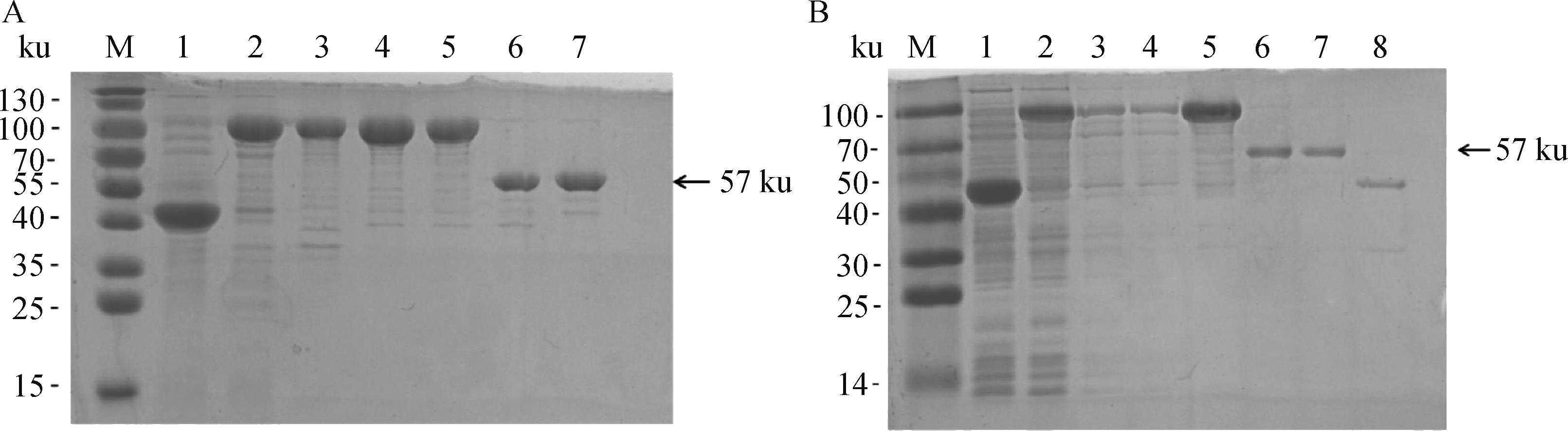 Purification results of recombinant RdRp protein after digestionA. Digestion and purification of RHDV1-RdRp protein: M.Marker; 1. No-load induction control; 2. Supernatant before purification; 3. Inclusion body; 4-5. Recombinant RdRp protein after purification; 6-7. RdRp protein after purification by enzyme digestion. B. Digestion and purification of RHDV2-RdRp protein: M.Marker; 1. No-load induction control; 2. Supernatant before purification; 3. flow through; 4. Cleaning; 5. Recombinant RdRp protein after purification; 6-7. RdRp protein after purification by enzyme digestion; 8. Eluted MBP protein"