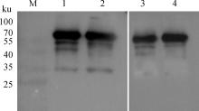 Western blot identification results of RHDV1-RdRp and RHDV2-RdRp proteins with positive infection seraM. Marker; 1-2. Western blot identification results of RHDV1-RdRp and RHDV2-RdRp proteins with RHDV1 positive infection sera; 3-4. Western blot identification results of RHDV1-RdRp and RHDV2-RdRp proteins with RHDV2 positive infection sera"