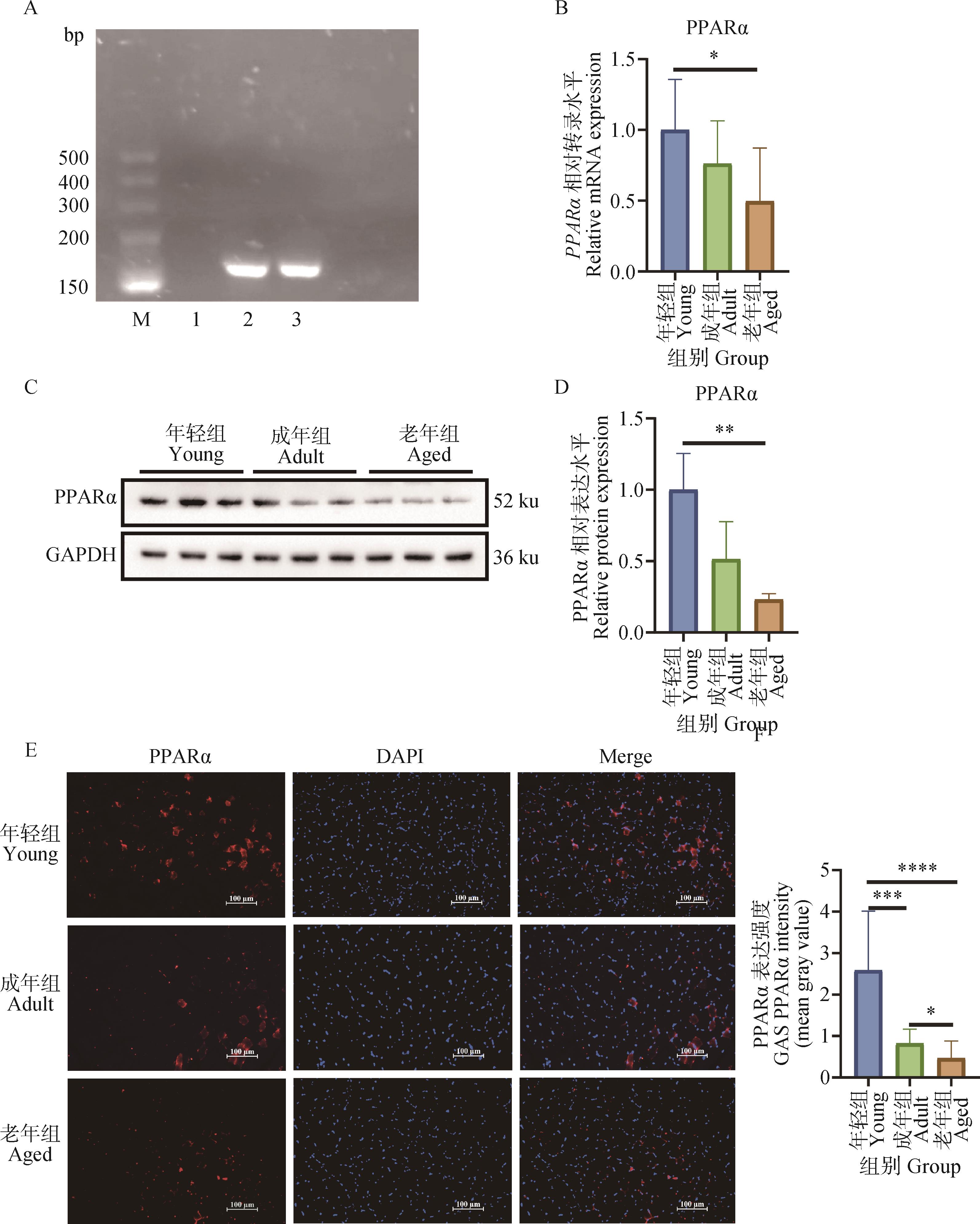 With the increase of age, the expression of PPARα in the gastrocnemius muscle of mice decreased at both mRNA and protein levelsA. PCR detection of PPARα expression in skeletal muscle (M. DL500 DNA marker; 1. Negative control, DEPC water; 2. Positive control, liver tissue cDNA; 3. Target band, gastrocnemius cDNA); B. Real-time quantitative PCR was used to detect the expression of PPARα; C, D. Western blot to detect the expression level and quantitative analysis of PPARα protein; E, F. Immunofluorescence was used to detect the expression and quantification of PPARα in gastrocnemius muscle at different developmental stages (in Fig.E, bar=100 μm). *. P<0.05, **. P<0.01, ***. P<0.001, ****. P<0.000 1"