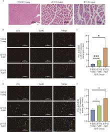 Morphology of gastrocnemius muscle and changes in P21 and P53 expression in young, adult, and aged miceA. HE staining of gastrocnemius muscle in young, adult, and aging mice (bar=100 μm); B, C. Immunofluorescence detection and quantification of P21 expression in mouse gastrocnemius muscle of different ages (in Fig.B, bar=200 μm); D, E. Immunofluorescence detection and quantification of P53 expression in mouse gastrocnemius muscle of different ages (in Fig.D, bar=200 μm). *. P<0.05, **. P < 0.01, ***. P<0.001"