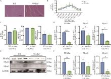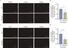 Knockdown of PPARα significantly reduces the positive areas of MyoD and Pax7 in the gastrocnemius muscleA, B. Immunofluorescence detection and quantification of MyoD in the gastrocnemius muscle of WT and PPARα-/- mice (bar=100 μm); C, D. Immunofluorescence detection and quantification of Pax7 in gastrocnemius muscle of WT and PPARα-/- mice (bar=100 μm). *. P<0.05, **. P<0.01"