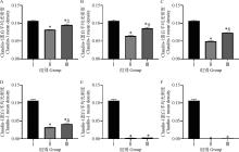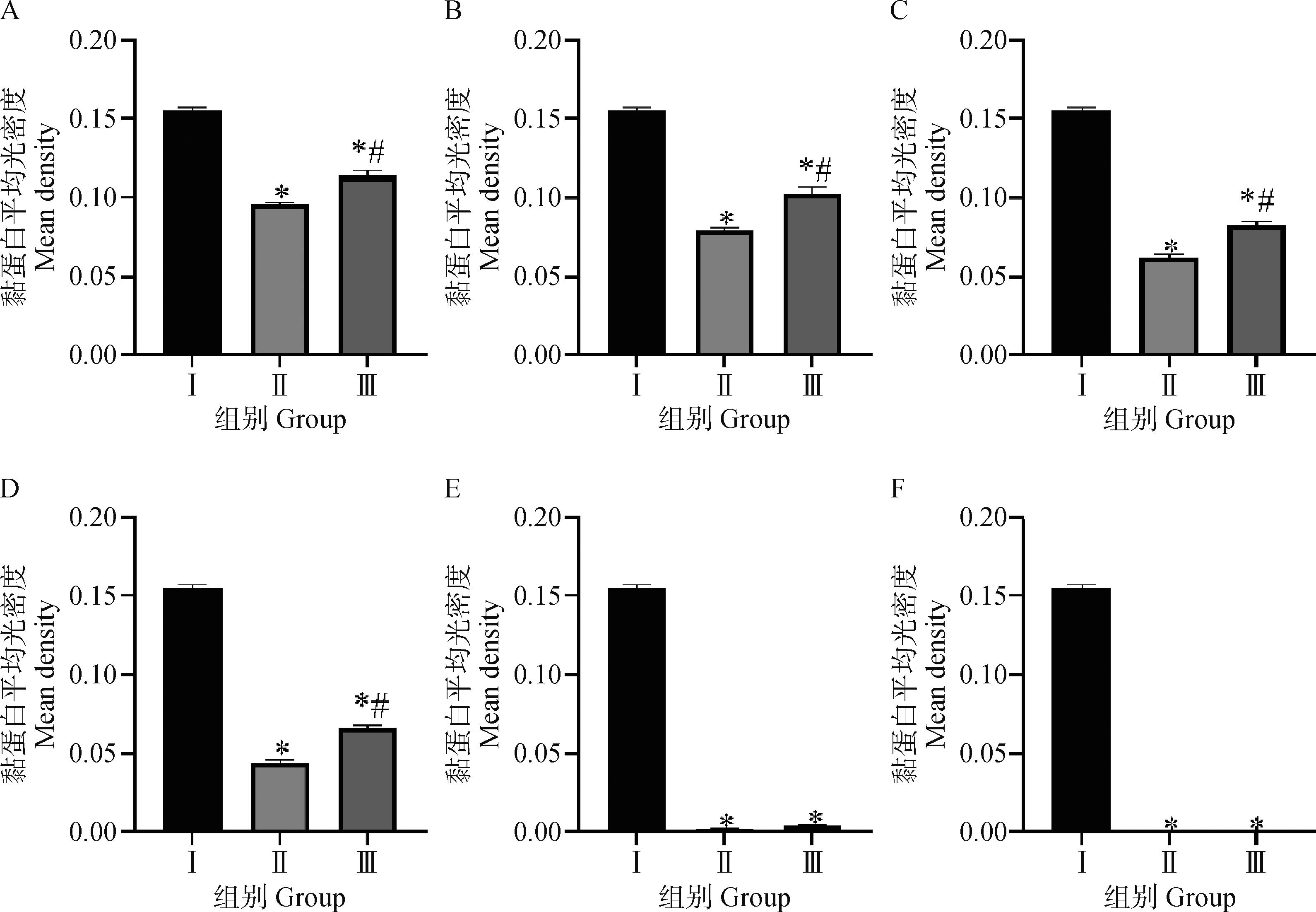 Mean optical density values of Occludin protein immunohistochemically positive area in the cecum of chicks in each experimental groupA-F. Dosing 1 day, dosing on the day, dosing on the 2nd, 3rd, 4th, 5th day of attack. The same as below. Compared with the healthy group, *.P<0.05; Compared with the infection group, #.P<0.05"